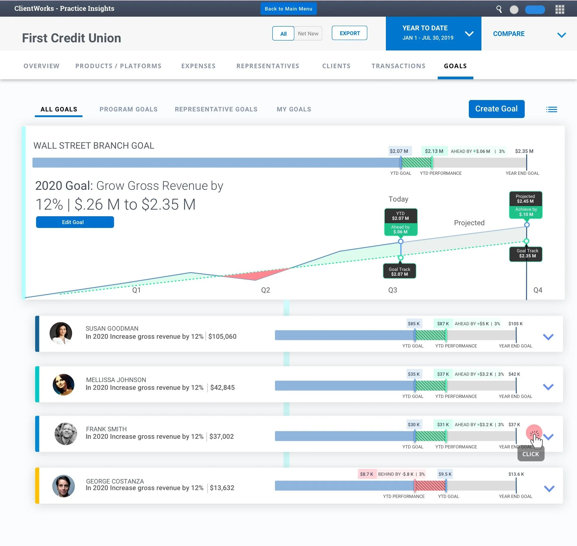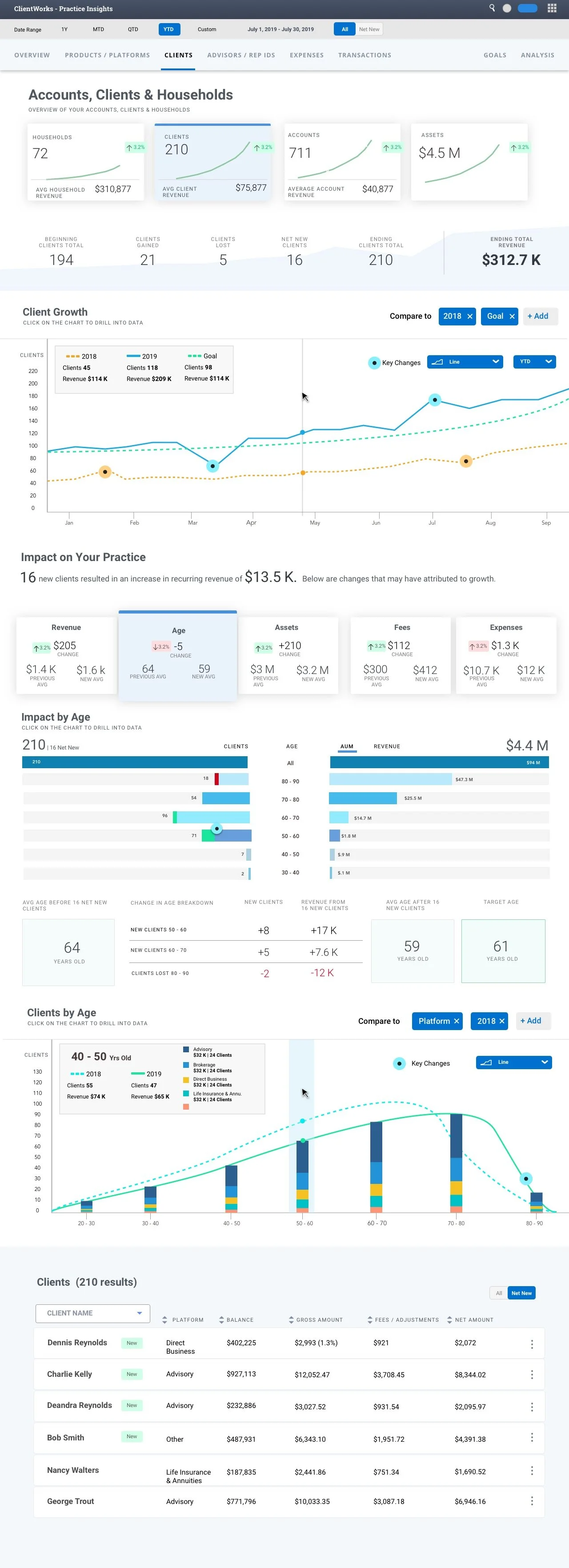 Financial practice managers need to be able to quickly glance at their various products and understand what is performing well. They need to be able to drill down into client data and expense data to understand key metrics which will help them run their practice more like a business. The proposed designs provide clear summary data about a branch, institution or or practice level performance in key areas.